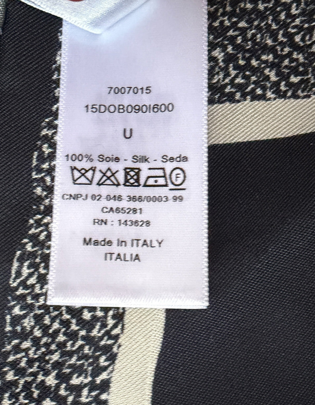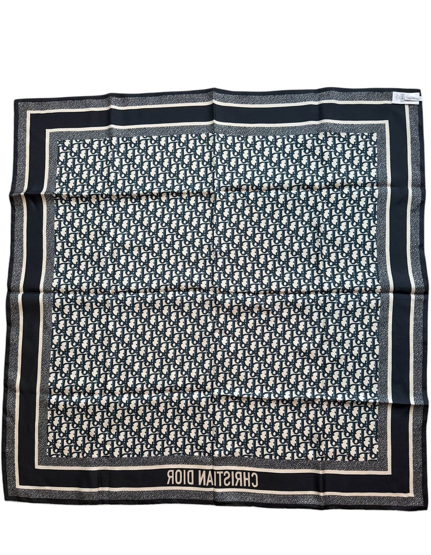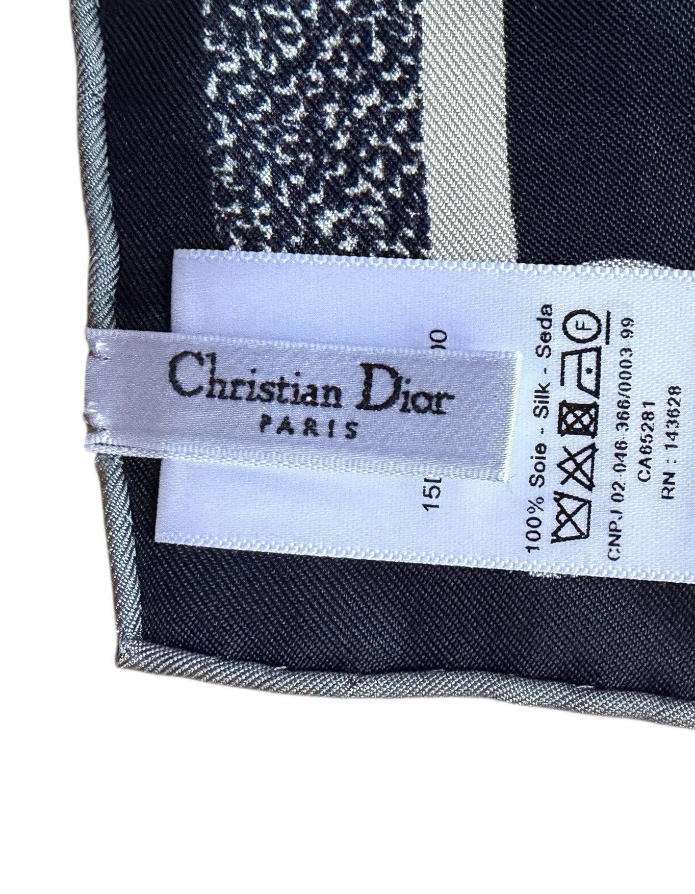 Regular price $395.00Dior Gray and Navy Blue Silk Twill Oblique Diortwin 90 Square. Crafted in silk twill, the design has hand-rolled edges with one gray side and a navy blue one, both embellished with a tonal Christian Dior signature jacquard band. The scarf can be tied at the neck or head to complete the Dior look. Scarf