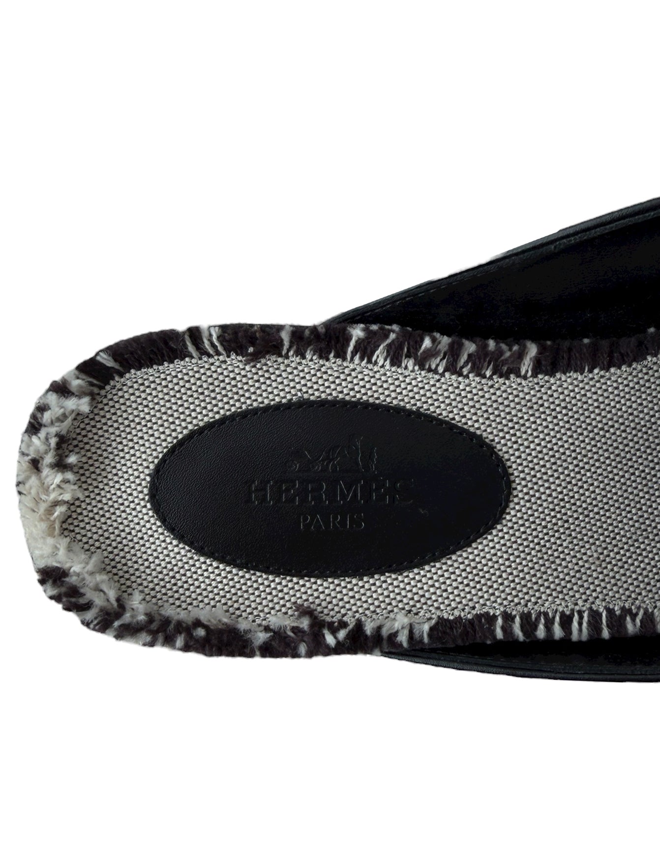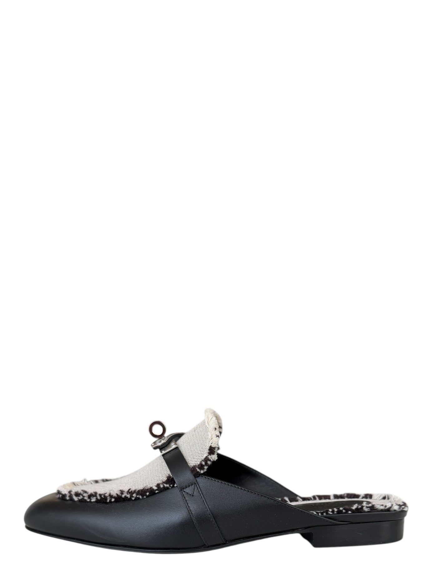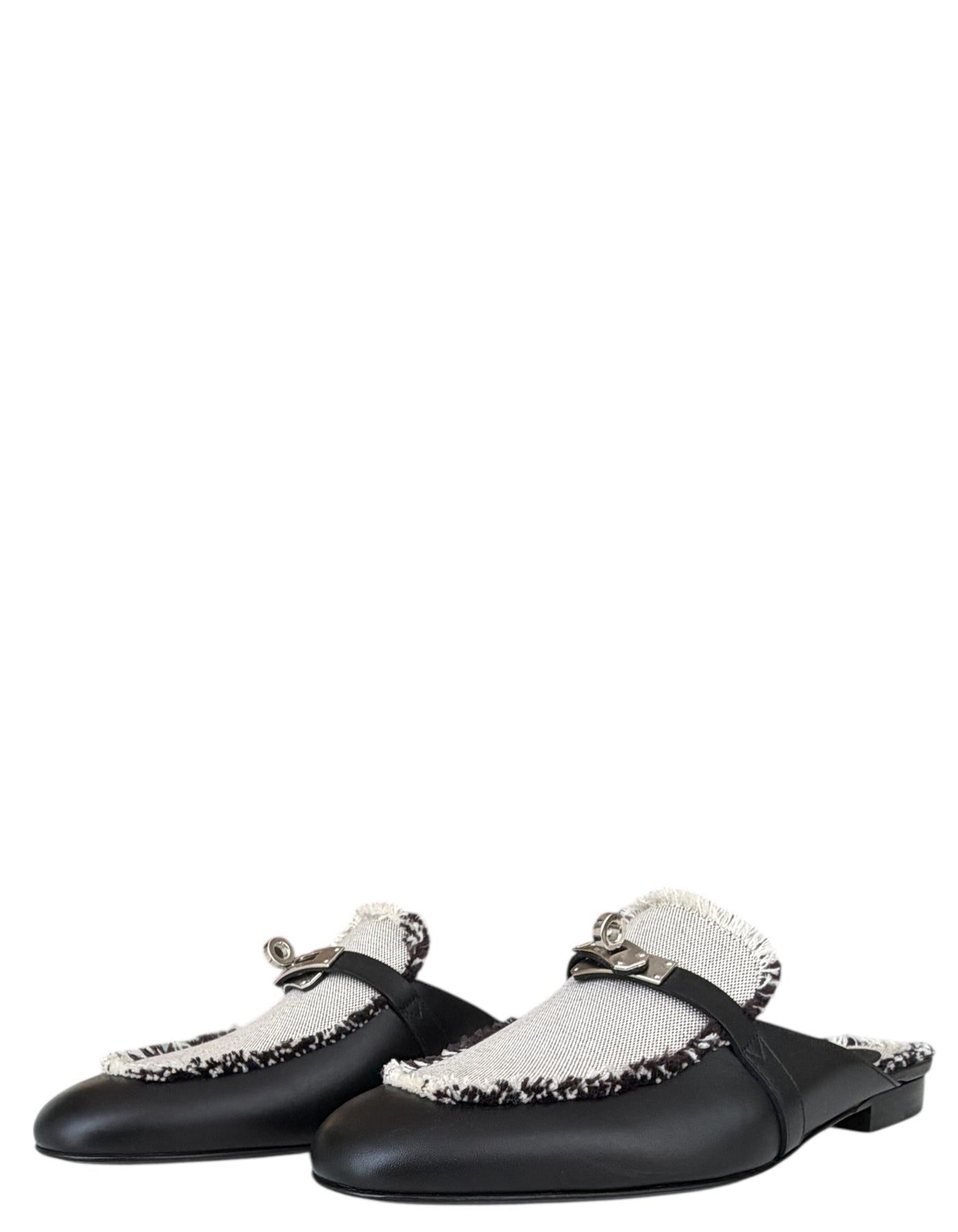 Regular price $845.00Hermes Black/White Toile Calfskin Fringe Oz Mules sz 39.5 with Palladium Kelly Buckle