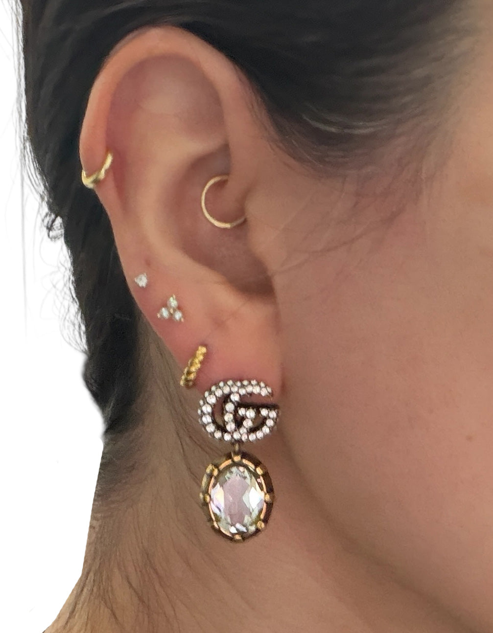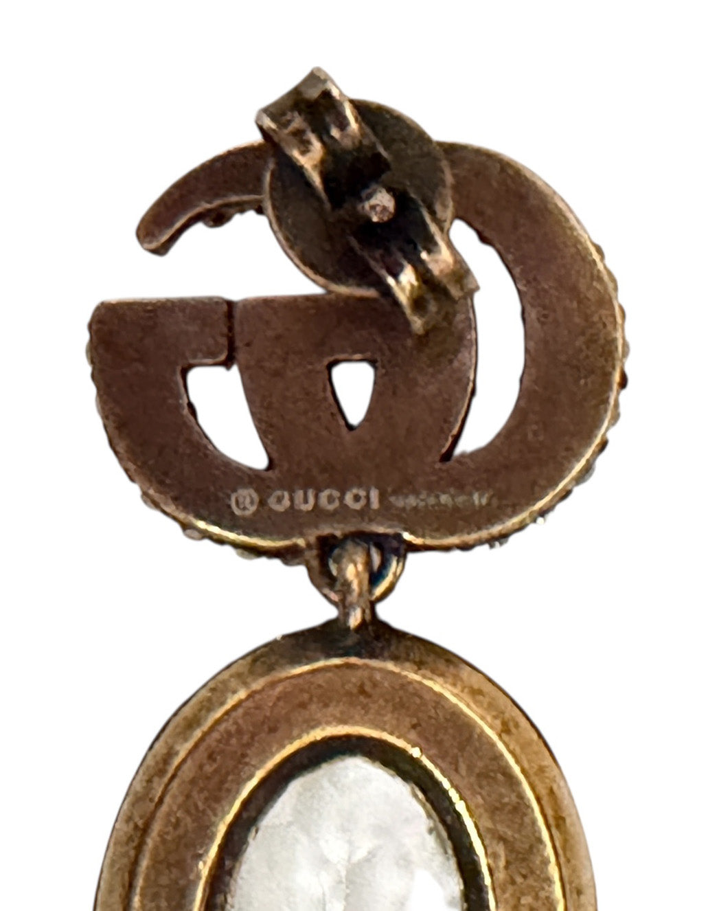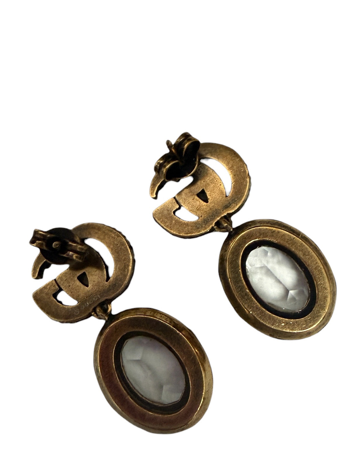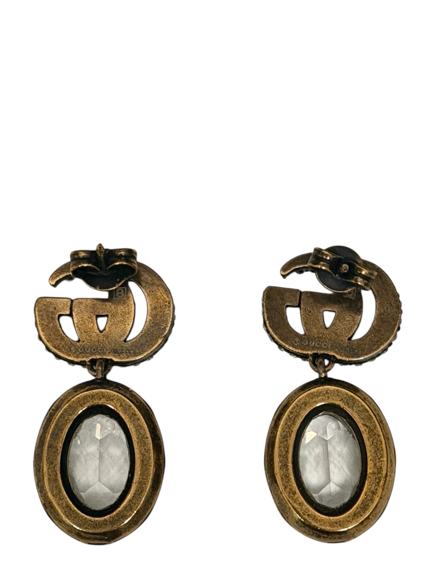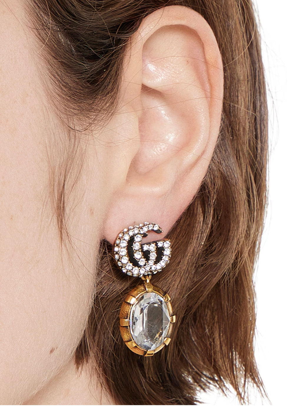 Regular price $295.00Gucci GG Marmont Crystal Pierced Earrings. A clear faceted crystal pendant combines with the crystal interlocking G detail, forming a sparkling pendant that completes these earrings in aged gold-toned metal.