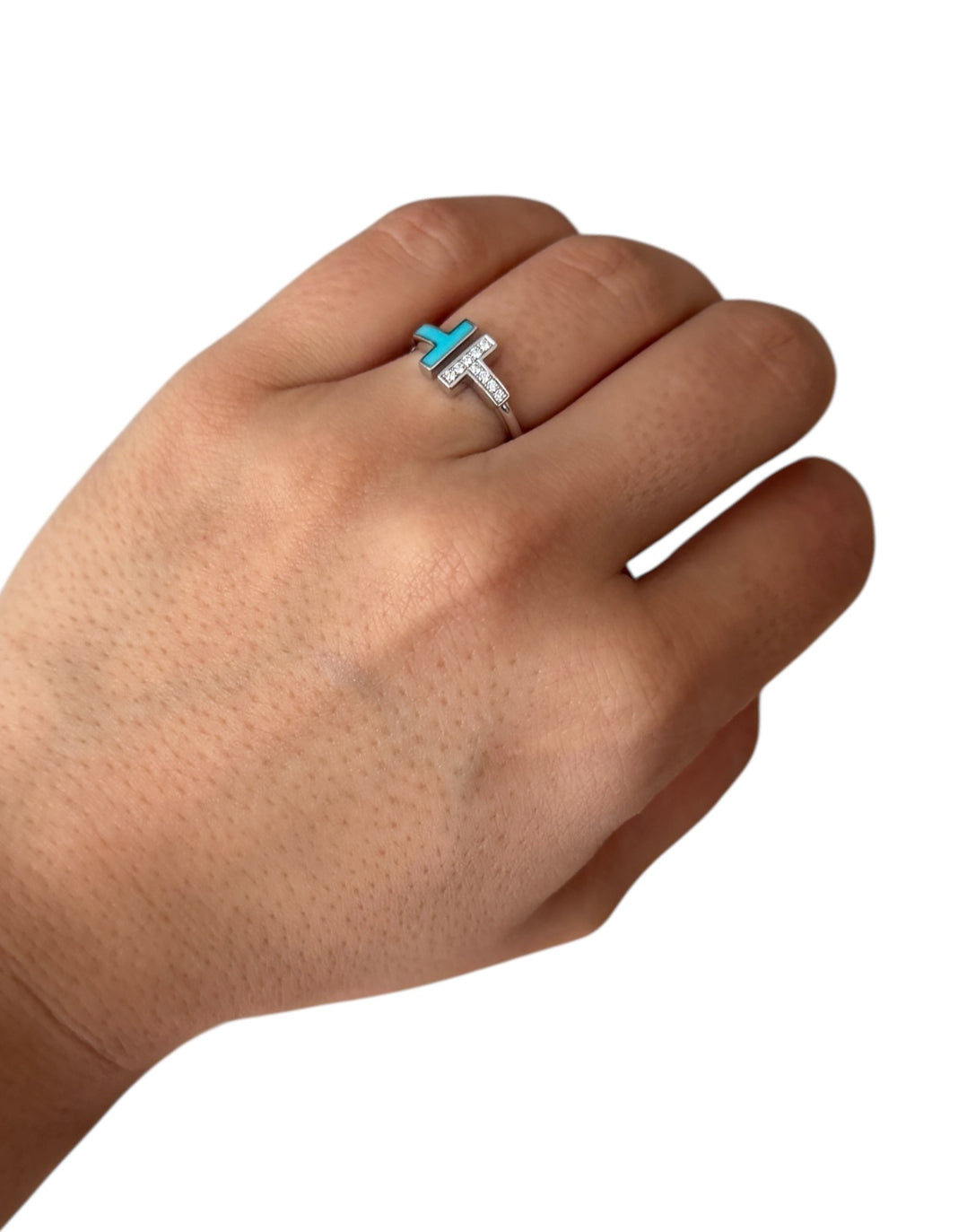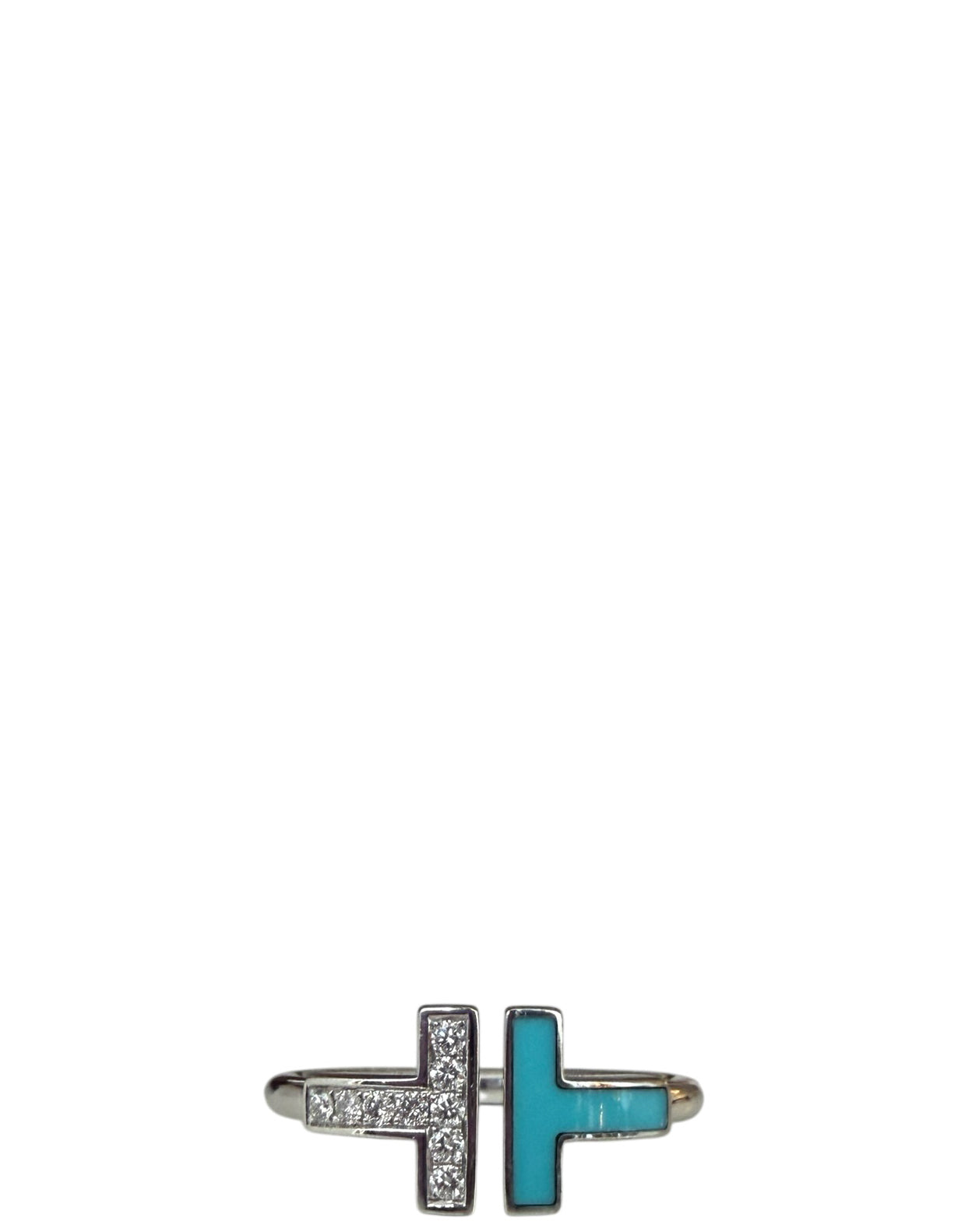 Regular price $2,395.00Tiffany White Gold Diamond & Turquoise T Wire Ring sz 7. This bold T design features diamonds and turquoise, a favorite stone of Tiffany designers for over a century. The natural formation of turquoise creates subtle differences in appearance, ensuring each ring is as unique as its wearer. Pair this wire ring with other Tiffany rings for a modern look, or simply wear it on its own.